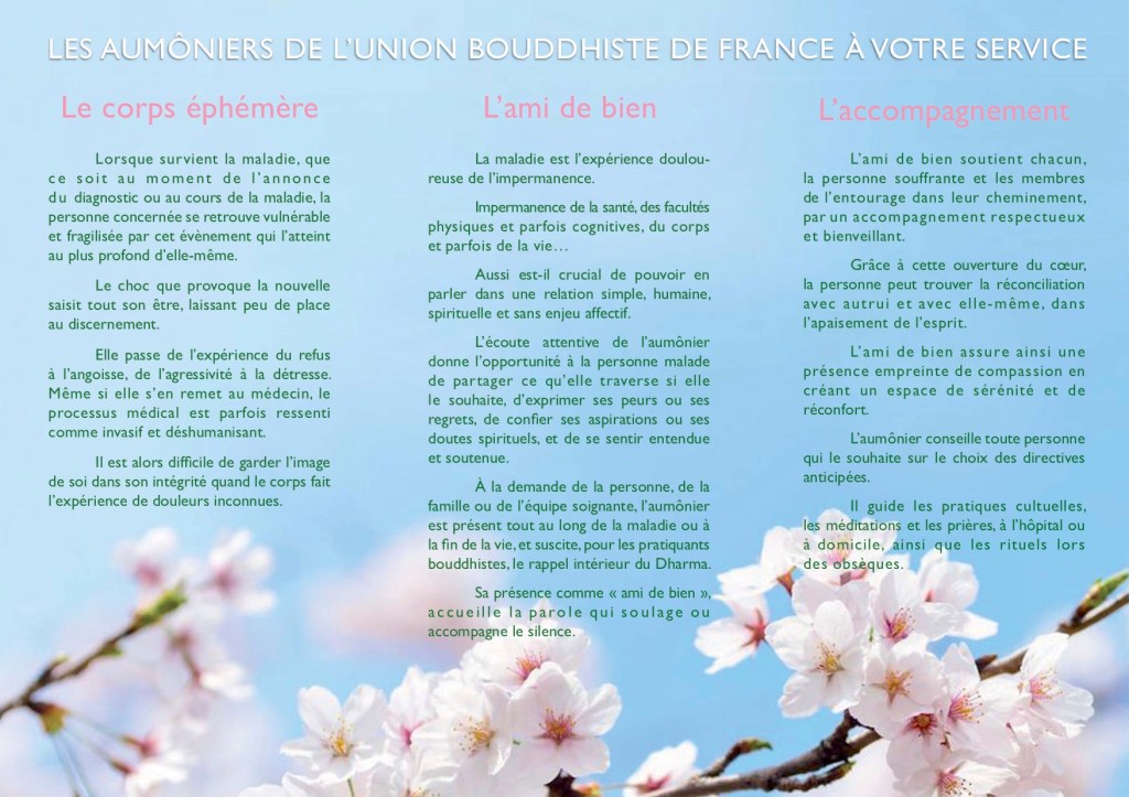 L’aumônerie de l’Union Bouddhiste de France en milieu hospitalier et médico-social existe et est reconnue par l’État Français depuis 2013. Elle est présente dans plusieurs départements avec ses aumôniers locaux ou départementaux, femmes et hommes laïques ou religieux-ses.