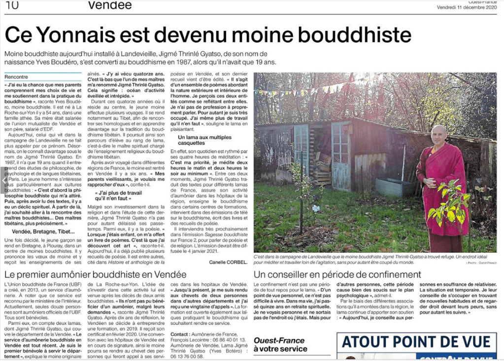 Article du journal Ouest-France du 11/12/2020 : portrait de Lama Thrinlé, ses activités d’auteur (avec la sortie de son dernier recueil poétique « Ainsi la poésie », éd. de l’Astronome — que l’article oublie de mentionner) et d’aumônier (avec l’ouverture prochaine d’une aumônerie bouddhiste des hôpitaux de Vendée) :