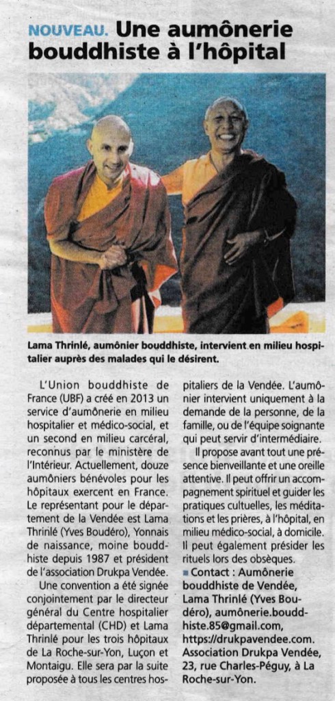 Le bouddhisme est une tradition bien présente auprès des vivants, des mourants et des morts pour les soutenir et les accompagner. C’est dans les moments difficiles que nous avons d’autant plus besoin de soutien. Les principaux établissements hospitaliers de Vendée connaissent depuis longtemps les coordonnées de Lama Thrinlé, et ont déjà fait appel à lui plusieurs fois (pour des réunions avec le personnel soignant pour mieux connaître les traditions religieuses et être ainsi plus à même de respecter la confession des différents patients, des formations d’infirmer-e-s…) .