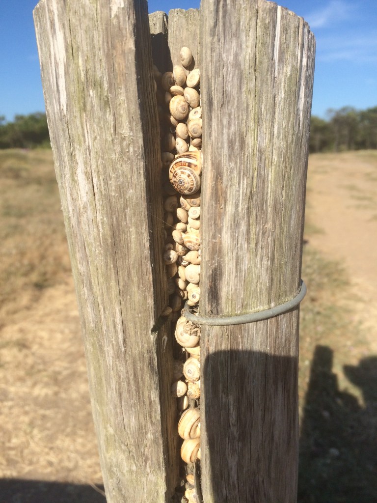 Escargots des dunes nichés dans un poteau de bois des dunes du Havre de la Gachère (photo Lama Thrinlé).