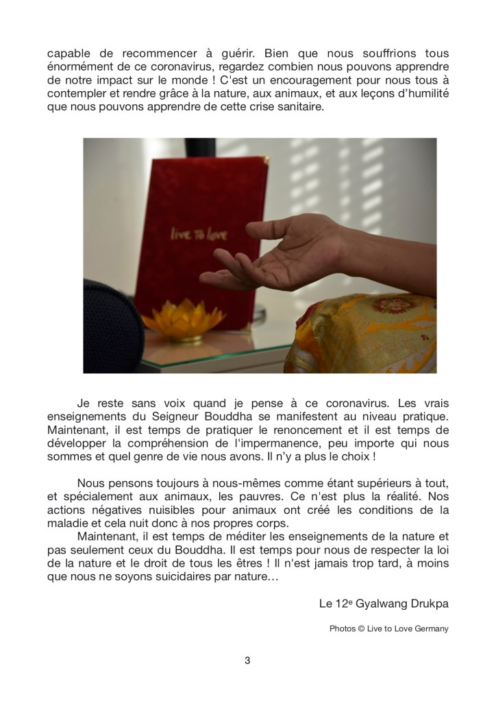 Allocution du Gyalwang Drukpa sur la pandémie du Covid-19 pour la télévision tibétaine : https://www.facebook.com/drukpa.vendee/videos/549119945738816/?modal=admin_todo_tour