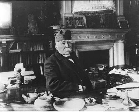 Georges Clémenceau au bureau de son domicile parisien, avec son bonnet tibétain sur la tête et une statue du Bouddha derrière lui sur la bibliothèque…