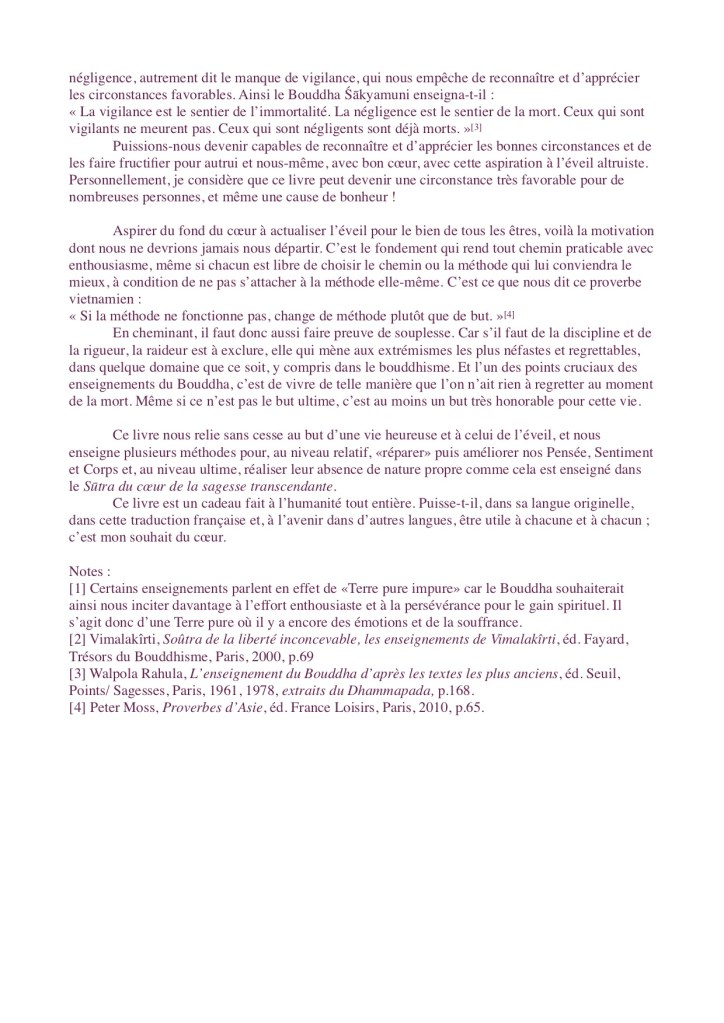 Moines, deux choses participent de la connaissance : le silence tranquille et l’intériorité. Si la tranquillité silencieuse est développée en soi, qu’est-ce que cela donne ? Cela permet à la conscience de se développer. Et quel est le profit d’une conscience développée ? Les désirs sont alors remis à leur juste valeur et peuvent être abandonnés. Et si l’intériorité est développée, quel profit cela apporte-t-il ? Cela permet à la sagesse de se développer. Et quel est le profit d’une sagesse développée ? Cela conduit à abandonner toute forme d’ignorance, à couper la racine de l’ignorance. Une conscience troublée par les désirs ne peut se libérer ; et une sagesse troublée par l’ignorance ne peut se développer. Ainsi l’on peut faire disparaître les désirs en délivrant son esprit et l’on peut faire disparaître l’ignorance en délivrant sa sagesse.