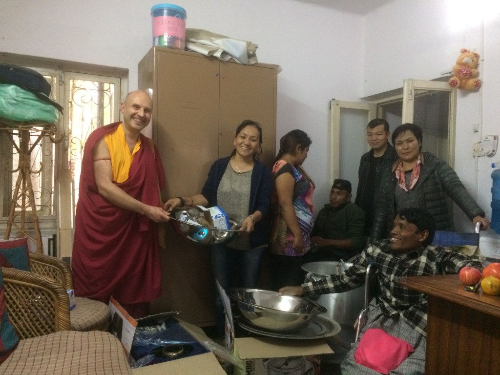 Lama Jigmé Thrinlé Gyatso offrant au centre Khagendra pour personnes handicapées tout le nécessaire pour la cuisine : cuisinière à gaz, gros réchaud à gaz, faitouts, bassines, verres et cuillères pour la soixantaine de résidents, 2017.