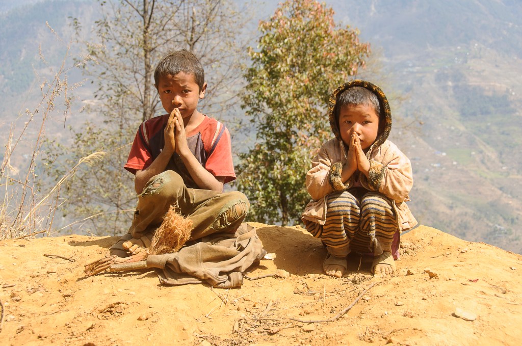 2 enfants népalais après le tremblement de terre en 2015, entre Kodari et Bakhang. Photo Yann Rollo van de Vyver, extraite du livre Himalaya, Népal, Ermitages en Pays Sherpa, éditions de l’Astronome.