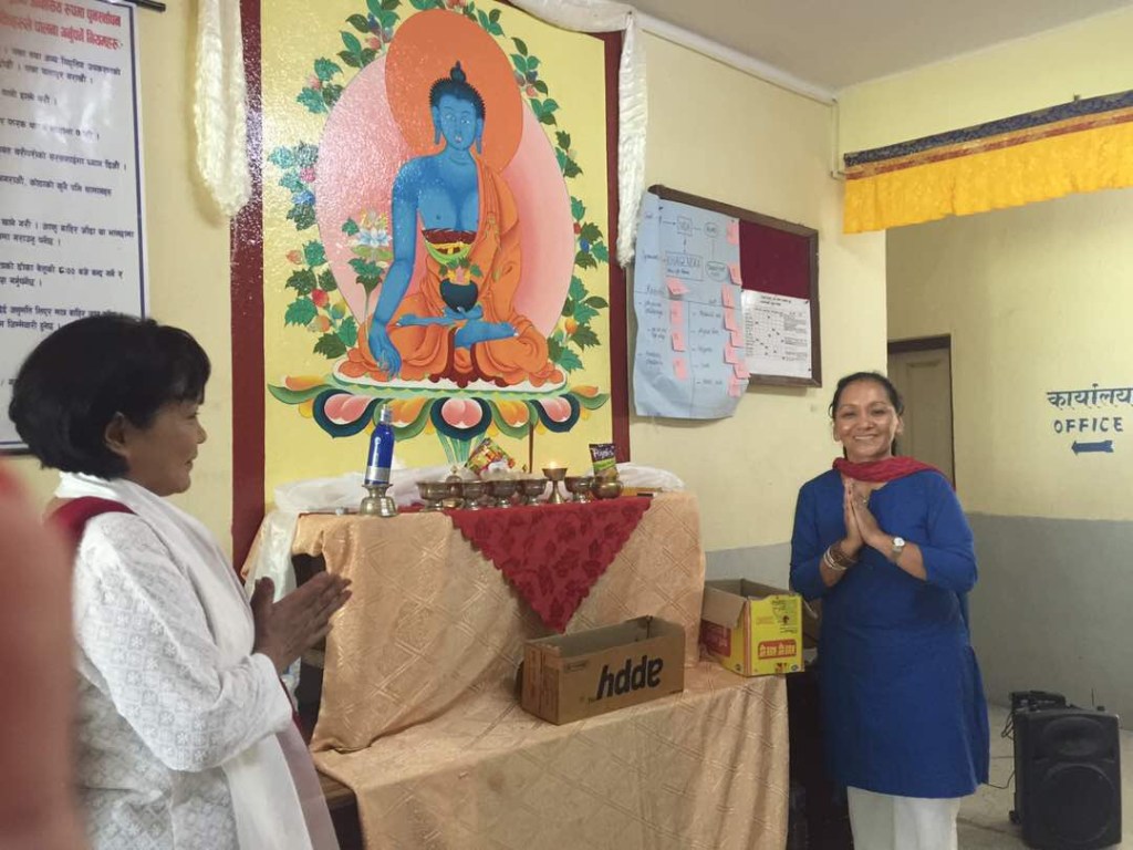 La directrice du centre pour personnes handicapées de Katmandou et Lobsang Drölma, autour de la fresque du Bouddha de médecine peinte par des artistes handicapés et offerte par Lama Jigmé Thrinlé Gyatso, parallèlement au don qu’il a fait de tout le nécessaire pour la cuisine.