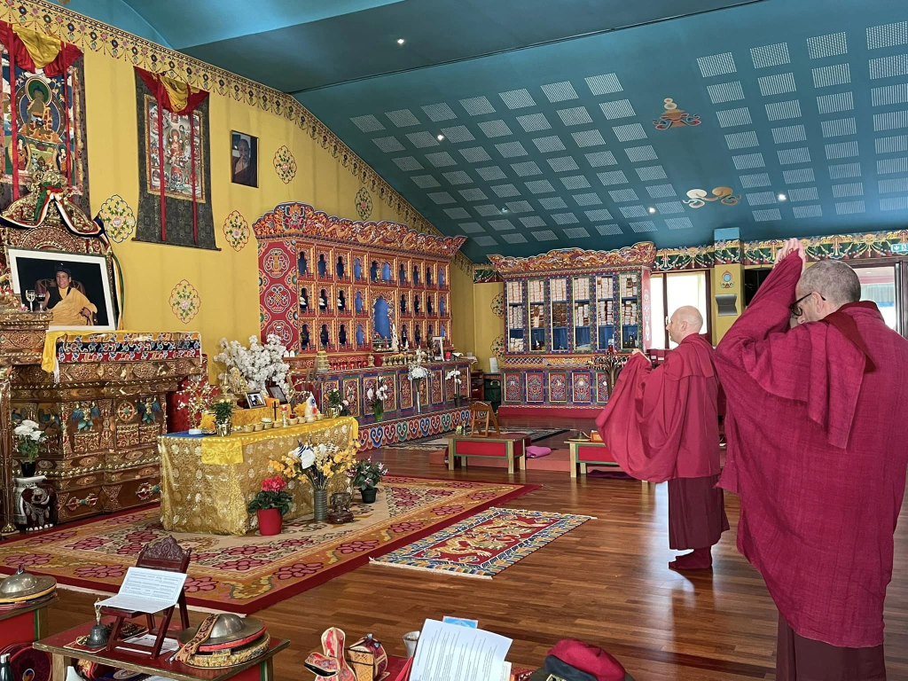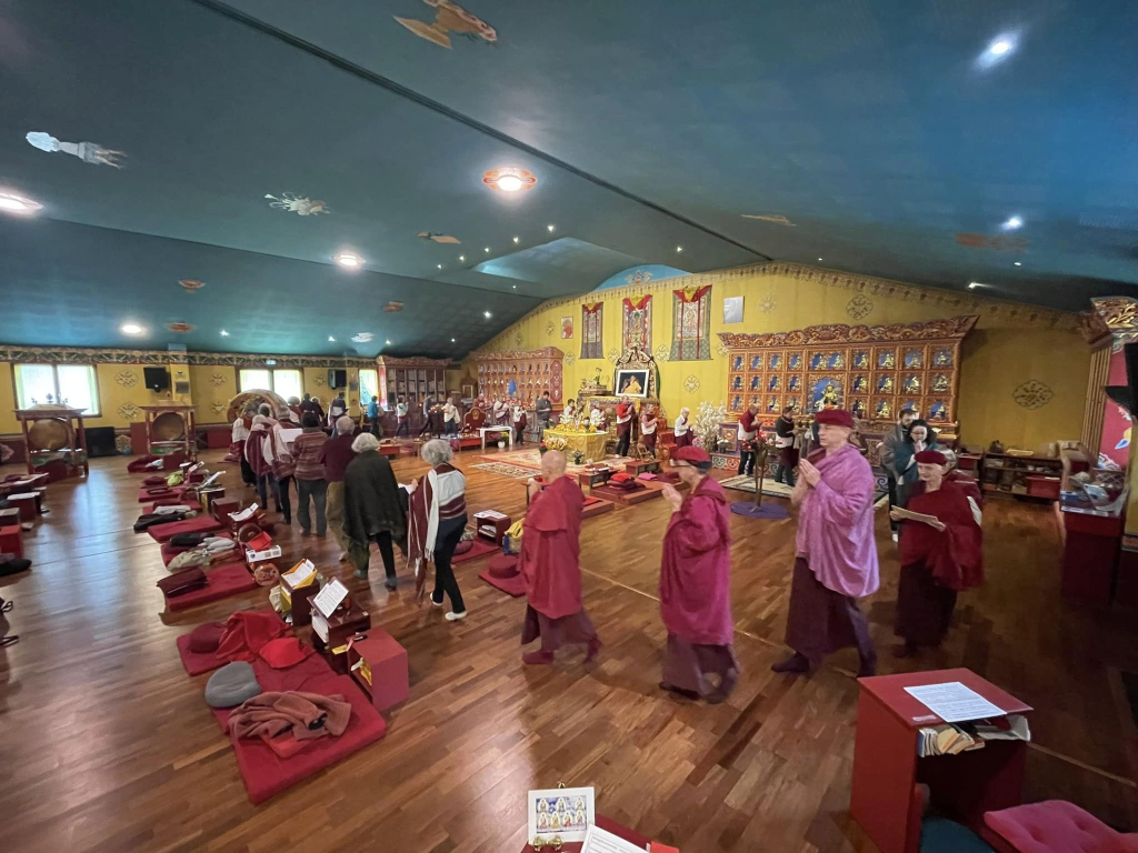 Fin de la retraite au centre Nehnang Samten Choling, ce matin. Hier soir, en remerciements pour les enseignements et de la pratique de Sangye Mennla que nous avons eu la grande chance de recevoir de Lopön Thrinlé Tenzin, nous avons fait un Tsok et une offrande de khata.